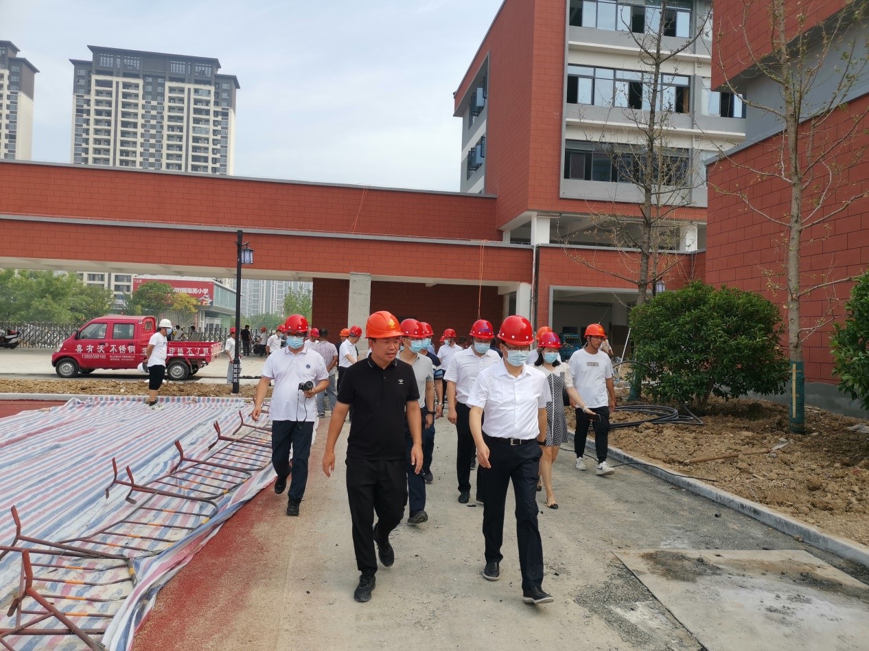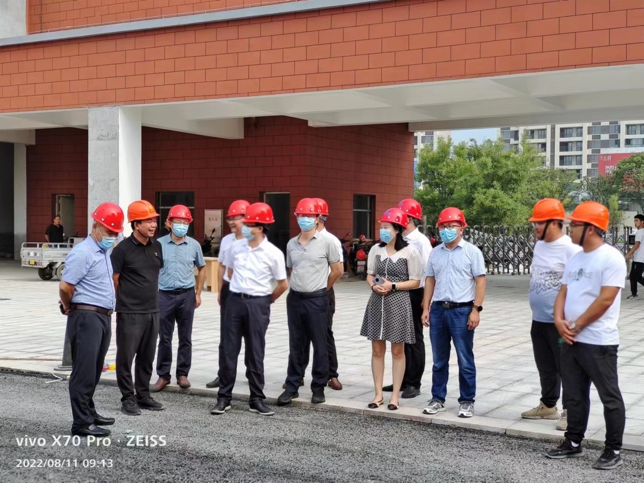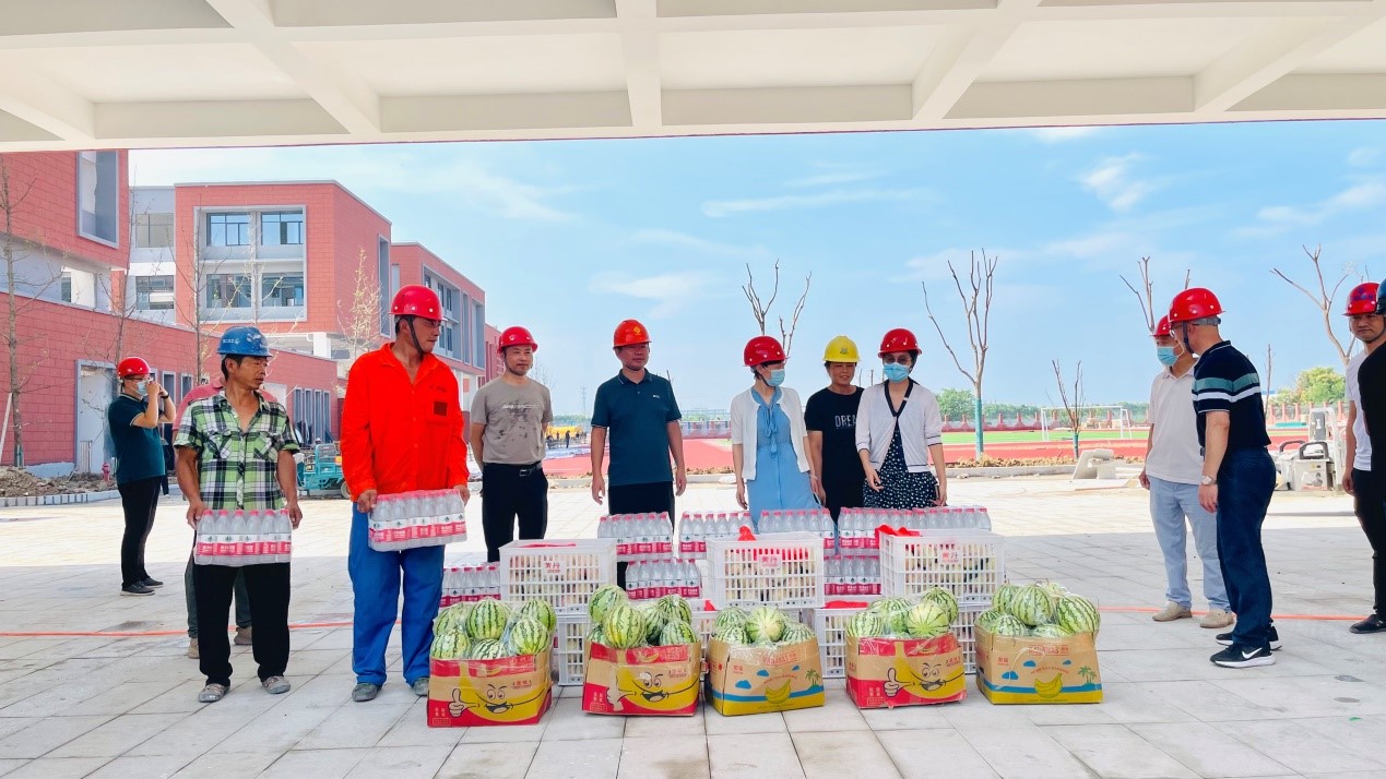次日,亳蕪園區(qū)管委會劉主任、教育局周局長到九小項目檢查指導(dǎo)工作,帶去慰問瓜果冷飲物品,關(guān)心高溫天氣下九小施工人員的身體狀況。同時視察九小項目各個建筑物的完成情況,確保9月能夠迎來九小的第一批學(xué)生,也能夠提供給學(xué)生們一個安全舒適的學(xué)習(xí)環(huán)境。