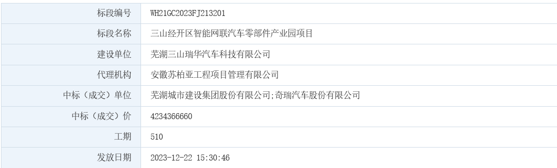 三山經開區(qū)智能網聯汽車零部件產業(yè)園項目位于三山經濟開發(fā)區(qū),地塊北至疏港路、西至橫山河路、南至長江南路,占地1620畝,主體包含1號聯合廠房、2號車間、3號車間及其配套工程的建設施工,生產生活設備的采購安裝調試等工程。該項目是蕪湖城市建設集團股份有限公司與奇瑞汽車股份有限公司以聯合體形式于2023年12月22日中標的項目,中標金額達42.3億元!