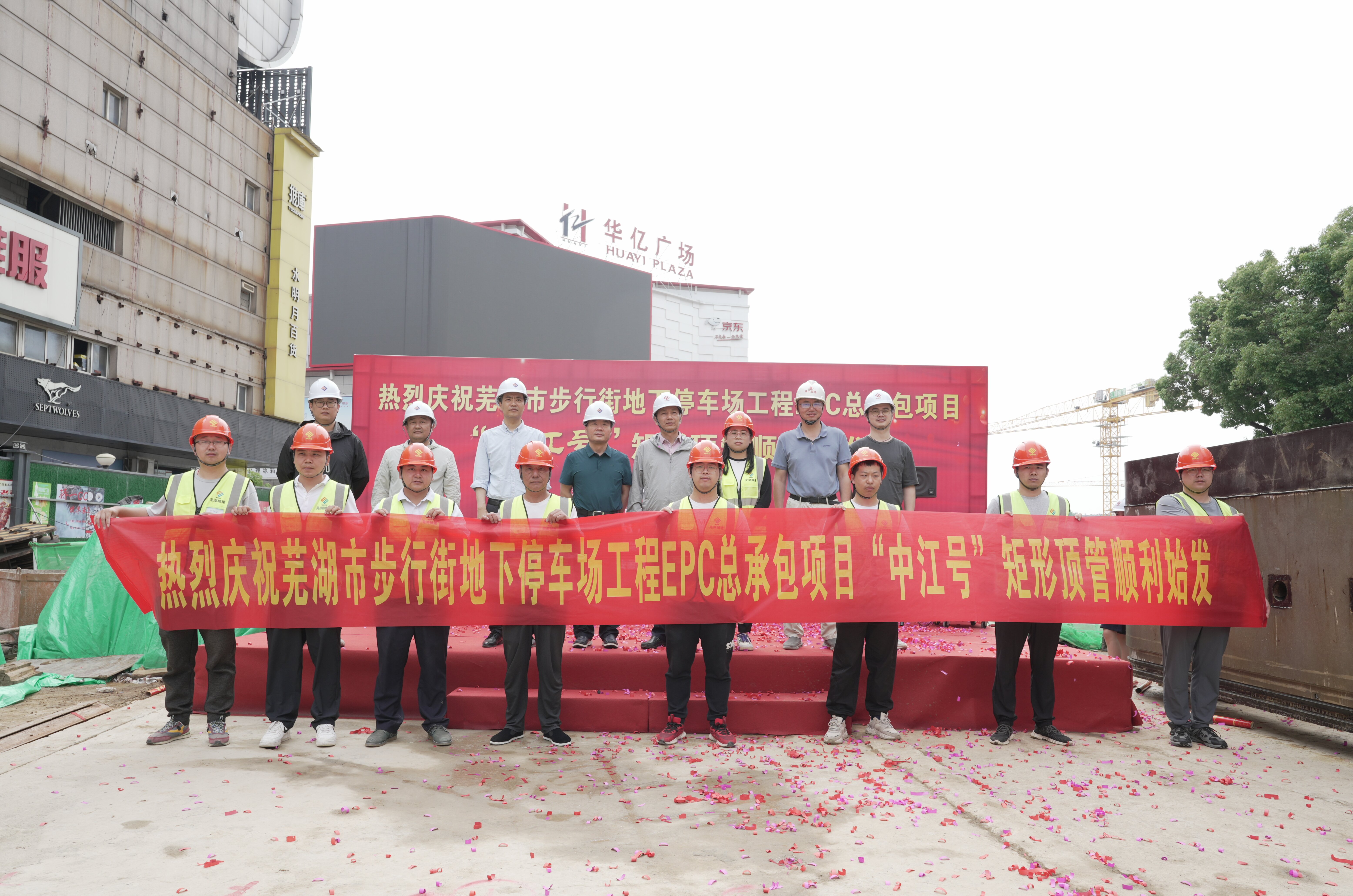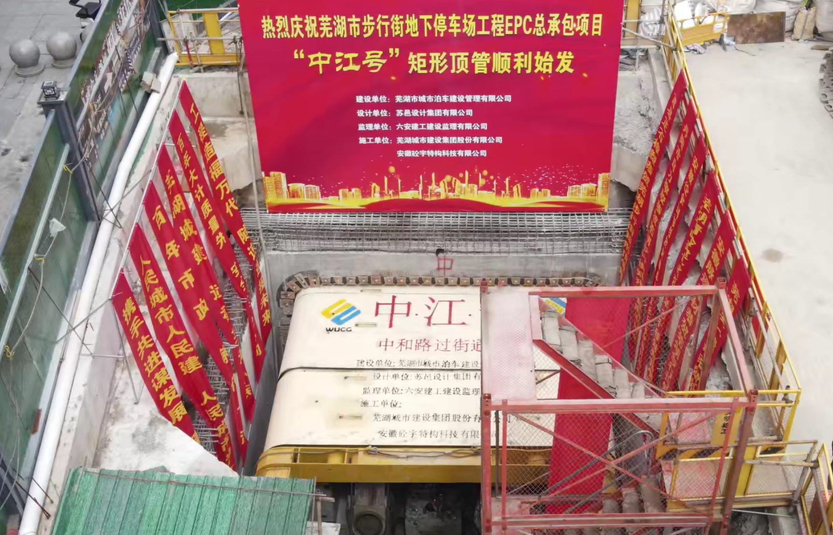 2024年5月22日,蕪湖市中和路步行街地下停車(chē)場(chǎng)工程舉行矩形頂管頂進(jìn)始發(fā)儀式,安徽中江城建集團(tuán)有限公司董事長(zhǎng)朱志福、蕪湖市交通投資有限公司董事長(zhǎng)戴松柏出席儀式。