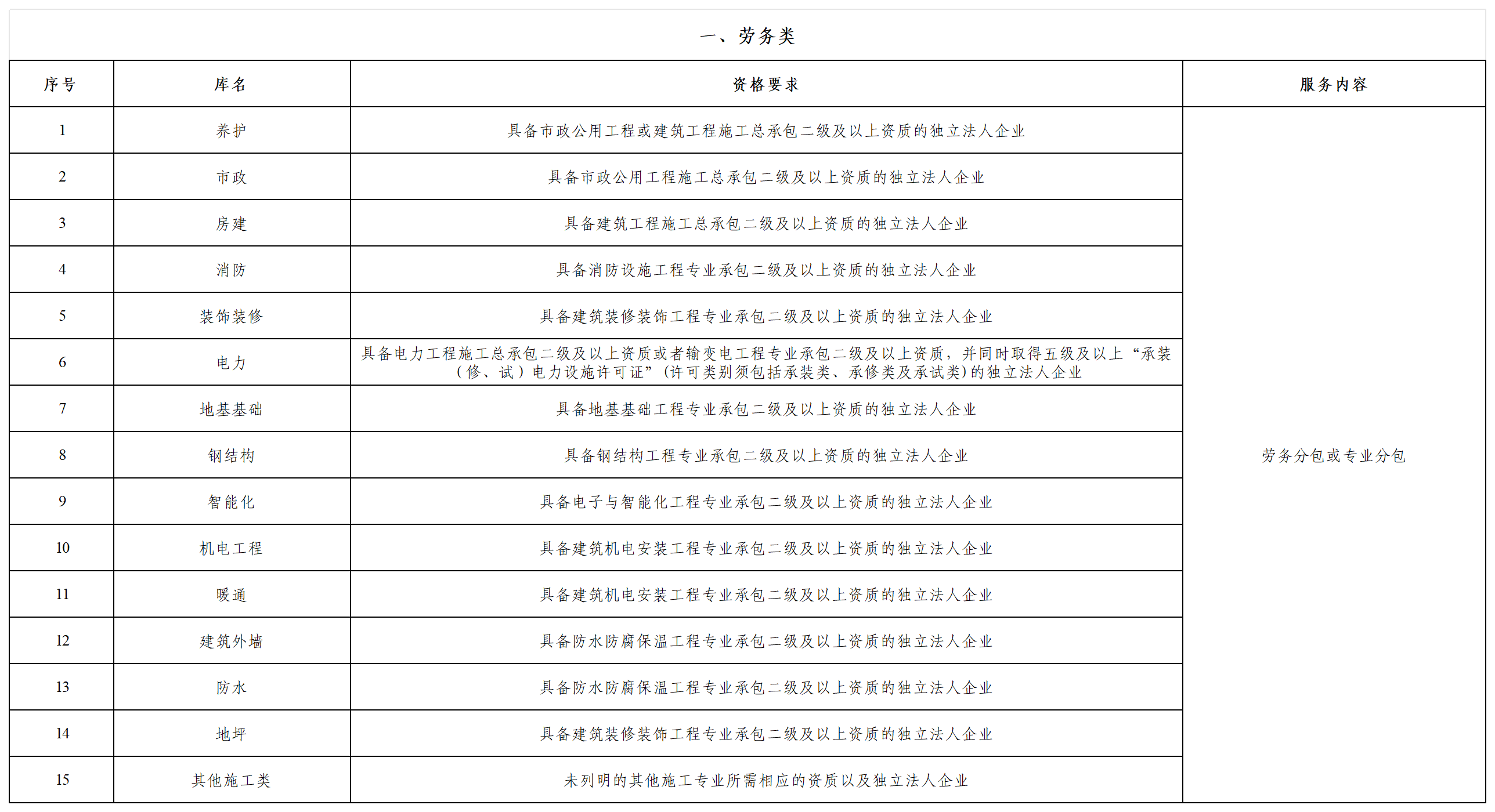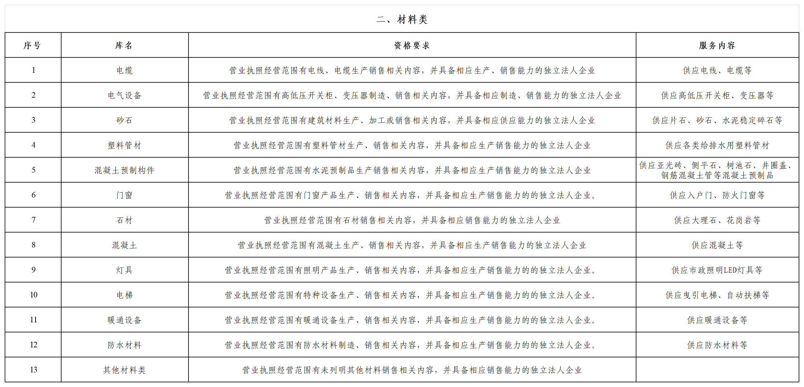 本次征集供應(yīng)商庫(kù)分為勞務(wù)和材料兩類,勞務(wù)類包含15個(gè)庫(kù),材料類包含13個(gè)庫(kù),應(yīng)征人可選擇其中一個(gè)或多個(gè)參與。